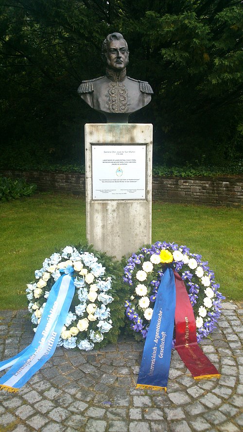 Feierliche Kranzniederlegung vor dem Nationalhelden. Seit dem Jahr 2009 steht inmitten der floralen Pracht des Wiener Donauparks ein Denkmal des südamerikanischen Unabhängigkeitskämpfers José de San Martin (1778-1850). Der Nationalheld war General jener Truppen, die Argentinien, Chile und Peru Anfang des 19. Jahrhunderts befreiten und dadurch die Unabhängigkeit von Spanien sicherten. Kaum eine argentinische Stadt, die nicht ihren Hauptplatz oder ihre Hauptstraße nach ihm benannt hat. Aus Anlass des argentinischen Nationalfeiertages am 14. Mai fand unter Beisein des argentinischen Botschafters, S. E. Rafael Mariano Grossi, und dem Präsidenten der Österreichisch-Argentinischen Gesellschaft/PaN, KommR. Mag. Christian J. Koidl, bei der Büste José de San Martin eine feierliche Kranzniederlegung im Wiener Donaupark statt. (gp) Foto: Gerlinde Puchwein