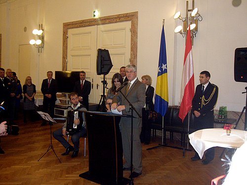 Aus Anlass des Tages der Armee der Streitkräfte von Bosnien & Herzegowina luden die Botschafterin, I.E. Dr. Tanja Milasinovic Martinovic, der Ständige Vertreter bei den Internationalen Organisationen in Wien und der OSCE, S.E. Tomislav Leko und der Militärattaché und Militärische Berater der Ständigen Vertretung, Col. Slobodan Tanasilovic am 9. Dezember 2014 zu einem Empfang in die Räumlichkeiten der Hofburg. Da auch eine hochrangige Delegation unter der Führung des Verteidigungsministers, S.E. Zekerijah OSMIC im Rahmen einer OSCE-Konferenz anwesend war, wurde diese Veranstaltung besonders aufgewertet. Nach den zahlreichen Reden und der Musikeinlage bosnischer Künstler wurde das Buffet eröffnet, das kulinarische Einblicke in die bosnisch-herzegowinische Küche ermöglichte. Nachdem zahlreiche Botschafter aus den Nachbarstaaten und einige aus dem EU-Raum die gebotenen Genüsse und die dazu passenden Weine genossen, muss man den anderen nicht anwesenden EU-Botschafter mitteilen: sie haben etwas versäumt. Vielleicht klappt es ja beim nächsten Mal, den Bosnien und Herzegowina hat einiges zu bieten. Wir dürfen uns für die Gastfreundschaft nochmals recht herzlich bedanken.