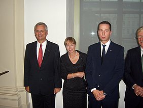 Diesmal hatte sich der Botschafter für den Jahrestag der Deutschen Einheit etwas ganz besonderes ausgedacht. Und so lud am 3. Oktober 2013 der Botschafter der Bundesrepublik Deutschland, S.E. Detlev Rünger und der Hessische Minister für Wirtschaft, Verkehr und Landesentwicklung, Florian Rentsch zu einem Empfang in das Palais Liechtenstein. Im hervorragenden Rahmen dieses wunderbaren Hauses fand im Herkules Saal die Begrüßung durch den Botschafter, gefolgt von der Rede des Bundesministers für Wirtschaft, Familie und Jugend der Republik Österreich, Dr. Reinhold Mitterlehner und dem Hessischen Minister, Florian Rentsch statt. Alle lobten die hervorragenden Beziehungen und die intensiven, wirtschaftlichen Verflechtungen der beiden Nachbarländer und hofft, dass dies noch lange andauern möge. Danach intonierten Mitglieder des Chores der Wiener Staatsoper unter der Leitung von Herrn Thomas Lang die Nationalhymnen der Bundesrepublik Deutschland und Österreich, die ganz besonders würde- und musikalisch eindrucksvoll präsentiert wurden und gaben anschließend noch weitere Kostproben ihres Könnens. Begleitet wurden sie am Flügel von Frau Kazuko Steller. Beim anschließenden Empfang bot man dann alles auf was die deutsche Küche so zu bieten hat und dies für hunderte Gäste. Die Wartezeit am Buffet konnte man mit einem Glas Bier oder Wein angenehm verkürzen. Der Hessische Minister ist jedoch nicht ohne Geschenke gekommen und so erhielt jeder Gast beim Verlassen des Festes noch Wein und Süßes auf den Heimweg. Damit hat die Bundesrepublik bewiesen, dass sie auch bei Festivitäten Leadership zeigt, wir danken recht herzlich für diese großartige Veranstaltung.