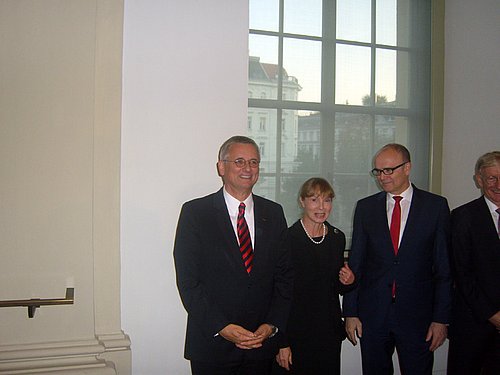 Tag der deutschen Einheit am 3. Oktober beging man heuer trotz geplanten Abriss des alten Botschaftsgebäudes mit gewohntem Aufwand, ja, man legte noch ein bisschen nach und feierte in einem Palais. Aus diesem Grund luden der Ministerpräsident des Landes Mecklenburg-Vorpommern Erwin Sellering und der Botschafter, S.E. Detlev Rünger am 2. Oktober 2014 zu einem umfangreichen Veranstaltungsprogramm mit Empfang in den Planetensaal des Palais Liechtenstein. Der Reigen begann mit der Begrüßung durch den Botschafter, danach folgte die Ansprache des Ministerpräsidenten. Aber auch Österreich ließ man zu Wort kommen mit einer Rede des Bundesminister für Arbeit, Soziales und Konsumentenschutz, S.E. Rudolf Hundstorfer. Nachdem Abspielen der Hymnen aber kam endlich die Kultur. Das Zwillingsduo Karolin und Friederike Stegmann brachte die 2.
