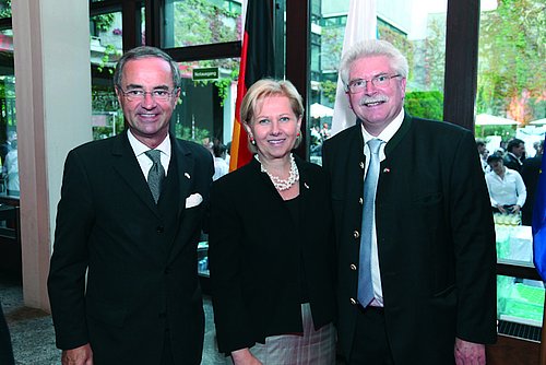 Botschafter Hans Henning Blomeyer-Bartenstein lud am 30. September 2011 gemeinsam mit dem stellvertretenden Ministerpräsidenten von Bayern und Staatsminister für Wirtschaft, Infrastruktur, Verkehr und Technologie, Martin Zeil als Vertreter des Freistaats Bayern zu einem gemeinsamen Empfang anlässlich des bevorstehenden Tages der Deutschen Einheit in die Botschaft. Die zahlreichen Gäste aus Politik, Wirtschaft, Kultur und Diplomatie, darunter Bundesminister Dr. Reinhold Mitterlehner, Präsident der Deutschen Handelskammer in Österreich Prof. Dieter Hundt, Apostolischer Nuntius Erzbischof Dr. Peter Stephan Zurbriggen, Nationalratspräsident a.D. Univ. Prof. Dr. Andreas Khol, Bundesminister a.D. Dr. Friedhelm Frischenschlager, Klubobmann Abg. zum Nationalrat Kopf, S.K.H. Luitpold Prinz von Bayern, Kammerschauspielerin Christiane Hörbiger und Kammersängerin Renate Holm feierten an einem milden Spätsommerabend den deutschen Nationalfeiertag mit bayerischer Färbung. Botschafter Blomeyer-Bartenstein erinnerte in seiner Ansprache an den Bau der Mauer vor 50 Jahren und brachte die Dankbarkeit der Deutschen für die Wiedererlangung der deutschen Einheit im Jahre 1990 zum Ausdruck. Besonders würdigte er das enge und vertrauensvolle Zusammenwirken Deutschlands mit Österreich, das auch und gerade in der gegenwärtigen Phase der europäischen Entwicklung von Bedeutung sei. Staatsminister Zeil würdigte Österreich auch als wichtigsten Wirtschaftspartner des Freistaats Bayerns, noch vor Italien, den USA und China.