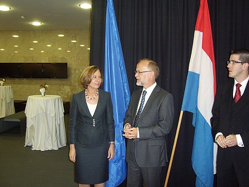 An einen ungewöhnlichen Ort, dem Atrium des Wien Museums, luden dieses Jahr die Botschafterin und Ständige Vertreterin bei den Internationalen Organisationen, I.E. Arlette Conzemius sowie der Ständige Vertreter bei der OSZE, S.E. Marc Thill anlässlich des Nationalfeiertages des Großherzogtums am 21. Juni 2010. Inmitten einer bunten Plakatausstellung bewegten sich die vielen diplomatischen Vertreter anfangs noch etwas ungewohnt aber zunehmend interessierter. Im Anschluss bat man in den Brahmsaal des Wiener Musikvereins wo das Orchestre de Chambre du Luxembourg „Les musiciens" unter der Leitung von Nicolas Brochot und der Cello-Solistin Francoise Groben Werke von Ludwig van Beethoven und Camille Saint-Saens aufführten.