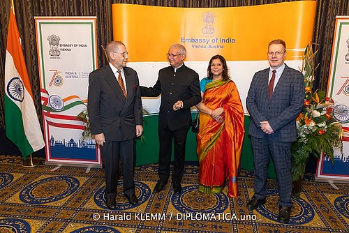Anlässlich des Nationalfeiertages von Indien luden der Botschafter, S.E. Jaideep MAZUMDAR und seine Gattin am 24. Jänner 2024 zu einem außerordentlich gut besuchten Empfang in die Festsäle des Hotel InterContinental. Gleichzeitig wurde auch das 75-Jahr-Jubiläum der Beziehungen zwischen Indien und Österreich gefeiert. Ein Konzert begleitete die Veranstaltung. Nach den Darbietungen der Hymnen beider Nationen und der Rede des Botschafters wurde das Buffet eröffnet, das eine Auswahl an indischen Spezialitäten bot.