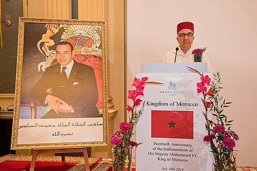 Aus Anlass des 20. Jahrestages der Thronbesteigung Seiner Majestät Mohammed VI. als König von Marokko luden der neuernannte Botschafter, S.E. Azzeddine Farhane und Frau Amina Idrissi Belkasmi am 30. Juli 2019 zu einen vielbeachteten Empfang in den Ballsaal des Grand Hotel Wien. Nach dem Abspielen der beiden Hymnen und der Begrüßungsrede des Botschafters, der erst seit etwa drei Wochen in Wien residiert, bat man zum Buffet und währenddessen wurde in kurzen Intervallen noch ein Videofilm über die Schönheiten Marokkos vorgeführt. Gäste gab es genug an der Zahl, denn, obwohl die Veranstaltung mitten in der Sommerurlaubszeit stattfindet ist bei diesen Empfang immer großer Zuspruch garantiert. Es ist wohl der Tatsache geschuldet, dass Marokko mit seiner stabilen Regierung und seinen taktisch geschickt agierenden König große Sympathien in allen Teilen der Welt besitzt. Zu Österreich hat das Land seit zweieinhalb Jahrhunderten beste Kontakte und Dank der Visionen des Königs gibt es seit sechs Jahren große Investitionen in der Wirtschaft. Es ist der stabile Eckpfeiler des Maghreb, wo landesübliche Usancen und westliche Traditionen in wohlausgewogener Harmonie sich vereinigen. Das ist sicher auch ein weiteres Merkmal, dass dem Land bis heute eine gewisse Sonderstellung in der arabischen Welt einräumt und so zu einen beliebten und sicheren Urlaubsland auf dem arabisch-afrikanischen Kontinent macht.