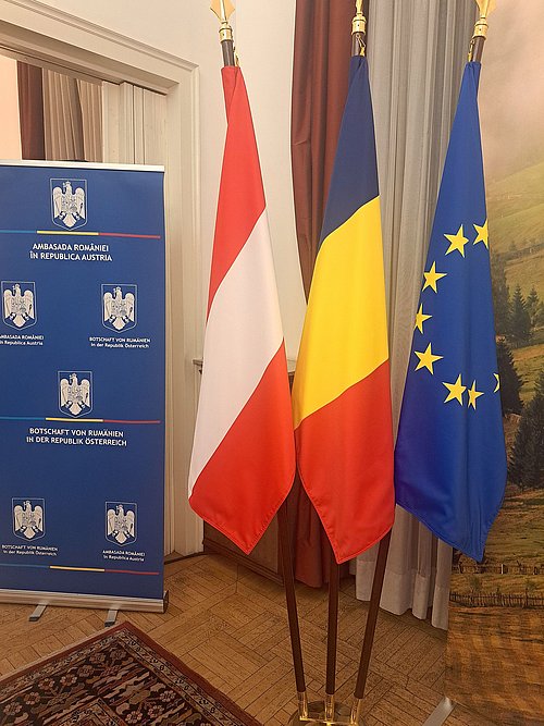 Aus Anlass des Nationalfeiertages von Rumänien luden die Geschäftsträgerin a.i. Frau Andrea AMZA-ANDRÁS und der Ständige Vertreter bei den Internationalen Organisationen, S.E. Stelian STOIAN am 3. Dezember 2025 zu einem Empfang in die Räumlichkeiten der Botschaft. Zahlreich waren die Gäste sowohl aus der rumänischen Community als auch österreichische Geschäftspartner. Die erwarteten Ehrengäste, waren der österreichische Bundeskanzler Christian STOCKER und sein Amtskollege, der rumänische Premierminister, Ilie BOLOJAN. Beide verbindet die Tatsache, dass sie ihre Ämter erst im heurigen Jahr übernommen haben. Nach den Reden und dem Abspielen der Landeshymnen gab es die Möglichkeit sich mit den beiden Regierungschefs auszutauschen, was reichlich in Anspruch genommen wurde.