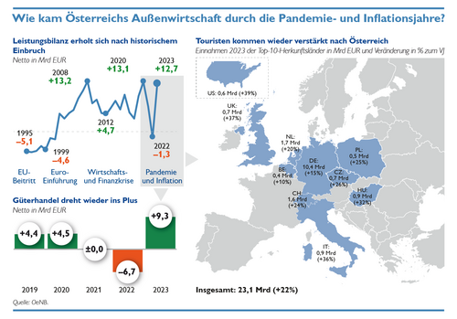 „Österreichs Außenwirtschaft bilanziert nach dem negativen Leistungsbilanzsaldo 2022 im Jahr 2023 mit 2,7% des BIP deutlich positiv. Dies ist ein Anzeichen, dass Österreichs Außenwirtschaft sich nach der erst kürzlich überwundenen Pandemie von den Auswirkungen des global herausfordernden Wirtschaftsumfelds mit außergewöhnlich hoher Inflation wieder erholt“, erläuterte Gottfried Haber, Vize-Gouverneur der Oesterreichischen Nationalbank (OeNB) .