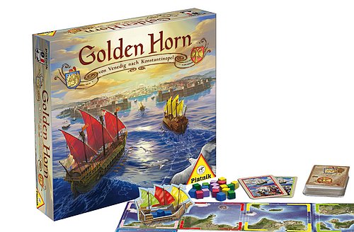 „Golden Horn“: Die Spieler bewegen ihre Schiffe auf der Handelsroute zwischen Venedig und Konstantinopel. Sie versuchen in den Häfen passende Waren zu erwerben oder als Piraten Güter von den Schiffen anderer Händler zu stehlen. Den Spielablauf treiben bunte Karten voran, die den Wind symbolisieren, der ein Schiff auf das nächste freie Feld der entsprechenden Farbe ziehen lässt. Vor allem kommt es darauf an, die Schiffe optimal zu beladen und in jeder Runde jenes zum Einsatz zu bringen, das die längste Wegstrecke zurücklegen darf. Wenn abgerechnet wird, zählt die Anzahl der ins eigene Lager transportierten Waren, aber auch deren Vielfalt. Das spannende Taktikspiel „Golden Horn“ begeistert Spiele-Fans ab 8 Jahren.