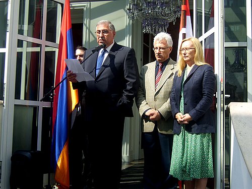 Um den 23. Jahrestag der Unabhängigkeit würdig zu begehen luden der Botschafter der Republik Armenien, S.E. Arman Kirakossian und seine Gattin Susanna Nazarian am 19. September 2014 zu einem Empfang in die Festräume des Le Palais Sans Souci in Wien. Botschafter Kirakossian ist gleichzeitig der Ständige Vertreter seines Landes bei den Internationalen Organisationen in Wien und bei der OSZE, sodass auch zahlreiche Kollegen aus den Internationalen Vertretungen zu diesem Empfang erschienen. Nach der Ansprache des Botschafters und dem Abspielen der Hymnen wurde die Ausstellung über armenische Teppiche und Textilien eröffnet, die Exponate aus verschiedenen internationalen Sammlungen aus 4 Jahrhunderten zeigten. Danach wurde ein hervorragendes armenisches Buffet eröffnet, an dem sich die vielen Gäste dieser Veranstaltung laben konnten.