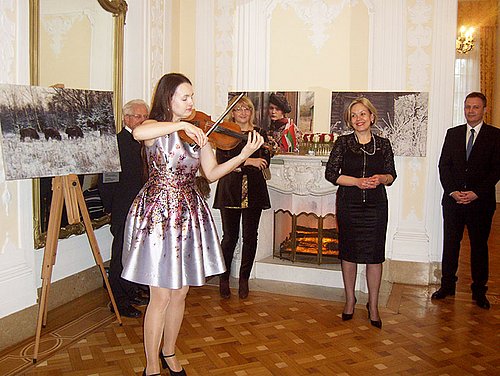 Aus Anlass des 25. Jubiläums der Aufnahme der diplomatischen Beziehungen zwischen der Republik Belarus und der Republik Österreich lud die designierte Botschafterin, I E. Dr. Alena Kupchyna am 21. Februar 2017 zur Eröffnung einer Bilderausstellung der bekannten belarussischen Künstlerin Irena Gudievskaya und einem anschließenden Cocktailempfang in die Räumlichkeiten der Botschaft. Das Art-Projekt „Charme“ umfasst eine Reihe von unterschiedlichen Veranstaltungen und wurde von den beiden Autorinnen Irena Gudievskaya und Tamara Gontscharowa unter der Schirmherrschaft des Nationalen Museums der Republik Belarus ins Leben gerufen. Die Fotoausstellung „Dichter Wald. Flachs. Schönheit“ soll die enge Verzahnung der Menschen mit der Natur in diesem Land aufzeigen und so zu einem tieferen Verständnis für den Reichtum des belarussischen Landes beitragen und zur Stärkung der eigenen Identität im Gesamtbild der Welt beitragen. Eine großartige Fotoshow mit beeindruckenden Bildern, die bei den Gästen auf reges Interesse stießen.