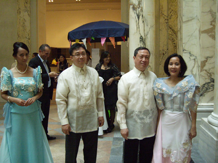 Aus Anlass des 111. Jahrestages der Proklamation der Unabhängigkeit der Philippinen und zur Unterstützung des Bekanntheitsgrades einer Publikation über die philippinischen Kunstschätze des Völkerkundemuseums luden die Botschafterin und Ständige Vertreterin bei den Internationalen Organisationen, IE. Linglingay F. Lacanlale und ihr Gatte Dr. Agerico am 15. Juni 2009 zu einem Empfang in die Säulenhalle des Museums für Völkerkunde. Nach einer kurzen Ansprache der Botschafterin, bei der sie auf die Kultur ihres Landes aber auch auf politische Themen Bezug nahm, konnten sich die Gäste an allerlei philippinischen Köstlichkeiten delektieren oder aber auch den angesprochenen Kulturgütern widmen. Um den Rahmen des Museums nicht zu sprengen waren heuer die Gästelisten einer Reduktion unterzogen worden, was sich wohltuend auf die Kommunikation auswirkte. Bemerkenswert die starke Präsenz österreichischer Gäste, was bedeutet, dass die Philippinen einen hohen Stellenwert und Beliebtheitsgrad in Österreich und bei Österreichern besitzen. Es war jedenfalls eine Einladung mit viel Gefühl und Geschmack.