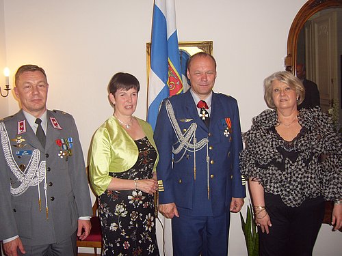 Aus Anlass des Armeefeiertages der finnischen Streitkräfte luden die Botschafterin, I.E. Marjatta Rasi, der Verteidigungsattaché Oberst i.G. Janne Pauni und der Militärberater Major i.G. Jari Salonen am 8. Juni 2011 zu einem Empfang in die Residenz. Nicht nur das geschlossene, ausländische Attachécorps auch viele ranghohe Offiziere des Österreichischen Bundesheeres und Missionschefs anderer Nationen sowie Vertreter österreichischer Behörden und Medien waren zugegen und boten, besonders durch die vielen Uniformen, ein buntes Bild. Passend zur Veranstaltung und durch sich widersprechende Zeitungsmeldungen ausgelöst versuchten einige Militärs durch intensive Diskussionen, die unergründlichen Ergebnisse der Gehirnwindungen des österreichischen Verteidigungsministers zu entschlüsseln, was aber selbst alt gedienten Spezialisten nicht gelang. Jedenfalls könnten wir uns an Finnland, nicht nur bei militärischen Angelegenheiten, auch finanzieller und verwaltungstechnischer Natur ein Vorbild nehmen, aber dies wäre ja für unsere derzeitige, offensichtlich an Kinderlähmung erkrankte Regierung zuviel der Anstrengung. Also ließ man schließlich dem Genuss den Vorrang, sagte alles Diskutieren ab und erfreute sich an der charmanten Botschafterin in ihrer geradezu hinreißenden Armani-Robe. Vielen Dank für die nette Einladung, wir lieben ihr Land besonders.
