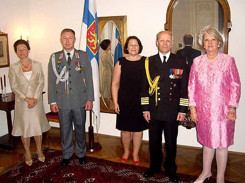 Zur Feier des Tages der finnischen Armee und ihrer Verteidigungskräfte luden am 1. Juni 2012 die Botschafterin, I.E. Marjatta Rasi, der Verteidigunsattaché Fregattenkapitän Juha Palaspuro und der Militärberater bei der OSZE, Oberstleutnant i.G. Jari Salonen zu einem Empfang in die Residenz. Auch hier war die Präsenz ihrer Kollegen aus den anderen Ländern sowie von Mitgliedern des österreichischen Bundesheeres beachtlich. Dieser kleine illustre Rahmen ermöglichte auch vielen Gästen fallweise bestehende Probleme untereinander anzusprechen und auszudiskutieren. Finnland zählt mit seiner ausgewogenen Politik und mit seiner soliden finanziellen Verankerung zu einem der wenigen konstruktiven Meilensteine in der Europäischen Union, was in der derzeitigen Verfassung der Union nicht hoch genug einzuschätzen ist. Finnland braucht keine Schlagzeilen, seine ruhigen diplomatischen Initiativen erreichen so weit mehr wie die charmante Gastgeberin immer wieder beweist.