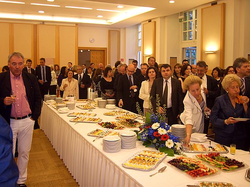 Aus Anlass des Nationalfeiertages und des Tages der Streitkräfte luden der Botschafter, S.E. Gordan Bakota und der Ständige Vertreter bei den Internationalen Organisationen in Wien und bei der OSZE, S.E. Neven Madey sowie der Verteidigungsattaché Oberst Mag. Tihomir Herceg und der Militärberater bei der OSZE, Kapitän zur See Davor Valdec am 27. Juni 2012 zu einem Empfang in Räume und Garten der Diplomatischen Akademie. Der Nationalfeiertag erinnert an die Unabhängigkeitserklärung während des Balkankrieges am 25. Juni 1991 und ist damit auch das 20jährige Jubiläum der Aufnahme diplomatischer Beziehungen zwischen Kroatien und Österreich. Offenbar aus diesem Jubiläum heraus lud man sowohl Diplomaten als auch kroatische Gesellschaft und kroatische Community gemeinsam ein, was zu umfangreichen Platzproblemen führte. Bei seiner Ansprache betonte der Botschafter die guten Beziehungen zwischen Kroatien und Österreich und bedankte sich auch für die große Unterstützung sowohl während es Krieges als auch für die Unabhängigkeit. Er konnte sich dabei gleich selbst beim Baumeister dieser Freundschaft, Ex-Außenminister Dr. Alois Mock und seiner Gattin bedanken, die neben zahlreichen Gästen aus Politik und Wirtschaft zu dieser Feier gekommen waren.