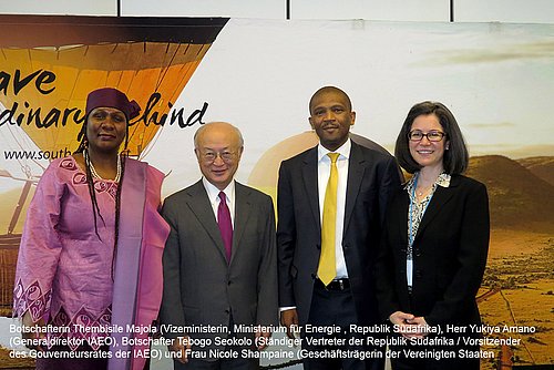 Zum Abschluss der Tätigkeit als Vorsitzender des IAEA Gouverneurrates und zu Ehren der Anwesenheit I.E. Thembisile Majola, derzeitige Vizeministerin für Energie der Südafrikanischen Republik lud der Botschafter und Ständige Vertreter bei der IAEA, S.E. Tebogo Seokolo am 21. September 2017 zu einem Lunchempfang in das VIC Restaurant des Vienna International Center. In seiner Abschiedsrede als Vorsitzender bedankte sich Botschafter Seokolo herzlichst für die gute Zusammenarbeit wobei er besonders die Tätigkeiten der dänischen, lettischen und niederländischen Ständigen Vertreter hervorhob. An diesem Lunchtermin nahmen auch eine Reihe von hochrangigen Diplomaten teil, an ihrer Spitze der Generaldirektor der IAEA, S.E. Yukiya Amano und die Geschäftsträgerin der Vereinigten Staaten bei der IAEA, Nicole Shampaine. Aus gutinformierter Quelle war zu hören, das Botschafter Seokolo sein Amt als Vorsitzender mit großem Fingerspitzengefühl sehr gekonnt ausführte, was ihm allgemein großes Lob einbrachte.