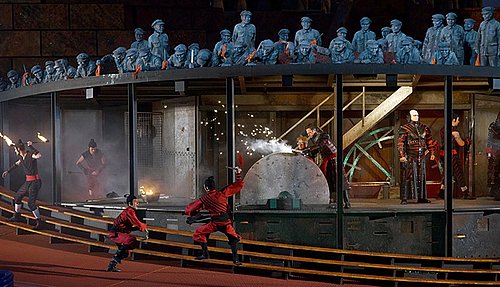 Der Inszenierung von Marco Arturo Marelli merkt man von Anfang an, dass sie nicht für die Seebühne eingerichtet wurde, sondern in ähnlicher Form bereits in Stockholm und später in Graz gezeigt und im April 2016 in der Wiener Staatsoper zu sehen sein wird. Sicher die monumentalen Ausmaße der Chinesischen Mauer und die Terrakotta-Armee im Bühnenhintergrund, die sich im Bodensee wohl ihr nasses Grab suchen soll, sind beeindruckend, allerdings nutzt Marelli in Wirklichkeit diese Chancen nicht sonderlich, lässt vornehmlich auf einen abgeschnittenen Zylinderstumpf spielen, der mit der Zeit etwas langweilig wirkt. Originell die drei Minister Ping, Pang und Pong in ihrer Gruselszene mit den Köpfen, stimmlich bemerkenswert André Schuen als Ping. Über den kurzen Auftritt des Kaisers im Rollstuhl und Prinzessin Turandot in einem Lampionsboot ist wenig zu sagen, da sie nur statuenhaft anzusehen waren. Riccardo Massi als Calaf und szenenweise auch Puccini-Double weist einen respektablen Tenor auf und ist sicher ein großer Gewinn für diese Aufführung. Dirigent Paolo Carignani gelingt mit den Wiener Symphonikern eine tadellose Musikinterpretation, die leider über die Tonanlage nicht immer wirklich zur Geltung kommt. Die Chöre aus Bregenz und Prag sollten umgehend an ihren Einsätzen arbeiten – wozu gibt es eine Chorleitung.