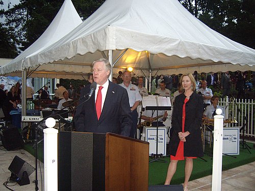 Aus Anlass des 235. Jahrestages der Unabhängigkeit der Vereinigten Staaten von Amerika luden der Botschafter, S.E. William C. Eacho, III und seine Gattin am 31. Juni 2011 zu einem Empfang im Rahmen einer Gardenparty in ihre Residenz in Wien-Hietzing. Dieser Empfang besitzt für die U.S.A. wie auch für Europa große historische Bedeutung und daher war es heuer ungewöhnlich, dass der Empfang nicht, wie sonst immer, am 4. Juli stattfand. Als Gäste konnte der Botschafter führende Persönlichkeiten aus allen Sparten der Politik, Wirtschaft und Kultur Österreichs begrüßen, das Ausland war durch unzählige Botschafterkollegen oder Militärattachées anwesend. Der Ablauf der Party folgte allerdings größtenteils dem bisherigen Protokoll. Bemerkenswerte Ausnahme war die Tatsache, dass die typischen amerikanischen „Hamburger" langsam durch europäische Gerichte ihre Ablöse finden und dies ist gut so. Großartig das Jazzorchester mit seiner sympathischen Gesangssolistin, eindrucksvoll wie immer die Fahnenpräsentation mit militärischen Ehren. Das Wetter hatte heuer zwar weniger gut mitgespielt als in den vergangenen Jahren, dass beliebte Feuerwerk fand dessen ungeachtet aber trotzdem statt. Auch heuer wieder war diese Veranstaltung eine deutliche Präsentation amerikanischer Lebensart und Lebenslust, wobei wir unsererseits herzlichst für die große Mühe und den Aufwand danken, die man sich in der Botschaft mit dieser Einladung machte. Aber nicht umsonst ist diese Veranstaltung eine der beliebtesten Botschaftsempfänge des ganzen Jahres – und darauf darf man in der Botschaft und den U.S.A. schon ein wenig stolz sein.
