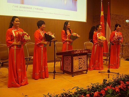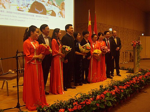 Aus Anlass des 64. Nationalfeiertages am 1. Oktober luden der neuernannte Botschafter, S.E. Zhao Bin und seine Gattin sowie der Ständige Vertreter bei den Internationalen Organisationen, S.E. Jingye Cheng am 24. September 2012 zu einem opulenten Empfang in den Festsaal des Austria Trend Hotel Savoyen Vienna. Als 11. Botschafter in Österreich begrüßte er die anwesenden Honoratioren aber auch seine Landsleute aus Hongkong, Macao und Taiwan, lobte die Errungenschaften der chinesischen Regierung in den letzten 30 Jahren trotz der lahmenden Wirtschaft und der anhaltenden Eurokrise, die die chinesische Wirtschaft unter großen Druck gebracht hat. Dennoch sind mehr als 95% der chinesischen Bevölkerung mittlerweile krankenversichert, ein Zeichen der Bemühungen eine Ausgewogenheit zwischen Sozialwesen und wirtschaftlichen Notwendigkeiten zu finden, die sich dennoch in einem durchschnittlichen Wirtschaftswachstum in den letzten Jahren von 11% niedergeschlagen hat. Großes Interesse galt dem bevorstehenden 18. Parteitage der Kommunistischen Partei Chinas, in der eine neue ‚kollektive‘ Führung gewählt und die Strategie für die Entwicklung des Landes im Sinne einer Weiterentwicklung der Reform- und Öffnungspolitik festgelegt werden wird. Die musikalische Begleitung der Feierlichkeiten gestaltete ein Quartett aus der Provinz Kanton, deren Delegation sich im Rahmen des Festaktes präsentierte und ein wenig chinesisches Flair in die nüchternen Räumlichkeiten des Hotels brachte. Riesig und reichhaltig war das Buffet, das sowohl mit chinesischen als auch österreichischen Spezialitäten aufwartete und noch weit über den Zeitrahmen hinaus für das Wohlbefinden der Gäste sorgte. Dass diese länger blieben gilt als Gradmesser einer sehr gelungenen Veranstaltung; wir gratulieren!