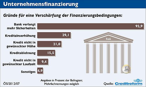 Die Auswirkungen der europäischen Staatsschuldenkrise sind auch im österreichischen Mittelstand zu spüren. Insgesamt hat sich der Zugang zu Finanzierungsmitteln bei 60,3 Prozent der Unternehmen verschärft. Die Art der Verschärfung ist vielfältig. 92,9 Prozent der unter schwierigen Finanzierungsbedingungen leidenden Unternehmen berichten, dass von den Banken mehr Sicherheiten verlangt werden. Eine Erhöhung der Kreditzinsen musste fast jeder dritte Mittelständler (29,1 Prozent) hinnehmen. Und 21,0 Prozent der befragten Unternehmen haben ihren Kredit nicht in der gewünschten Höhe erhalten.
