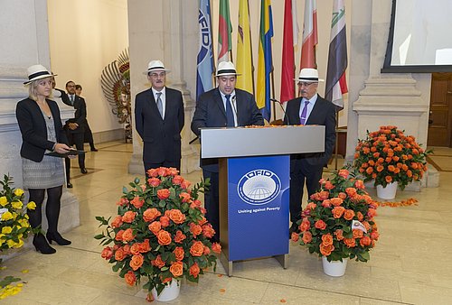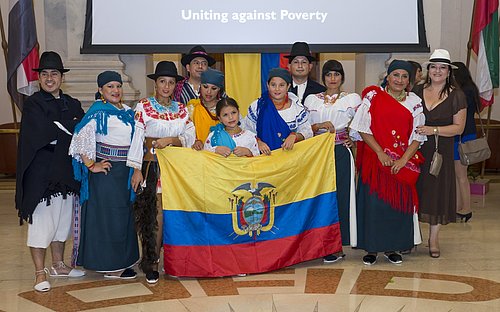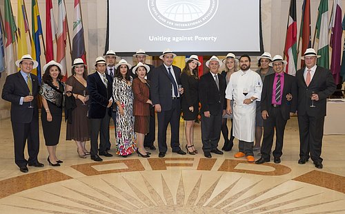 Ecuador’s Wiedereintritt zum Entwicklungsfond der OPEC/OFID bot Gelegenheit in den wunderschönen Sälen der OPEC am Ring das Land in allen Facetten zu präsentieren. Unter der Patronanz der Botschaft und des Botschafters, S.E. Wilson Pastor Morris und dem Generaldirektor der OFID, Herrn Suleiman J. Al-Herbish fanden sich fast alle Vertreter der Lateinamerikanischen Staaten ein um die Gemälde der drei berühmten ecuadorianischen Maler, Miguel Betancourt, Hernán Illescas und Juan Luis Millingalli zu bewundern. Die anwesenden Künstler erklärten fachkundig ihre Werke. Gleichzeitig wurden die wichtigsten Exportgüter Ecuadors angeboten, wie Bananen, Kakao, Kaffee, Textilien und die berühmten „Panamahüte". Und auch die kulinarischen Köstlichkeiten durften nicht fehlen; frisch zubereitete Shrimps von Starkoch Guillermo Mirando, der die 400 geladenen Gäste mit seiner Küche überzeugte. Wir dürfen uns für diesen gelungenen Abend und dem Feuerwerk an tollen Ideen recht herzlich bedanken.