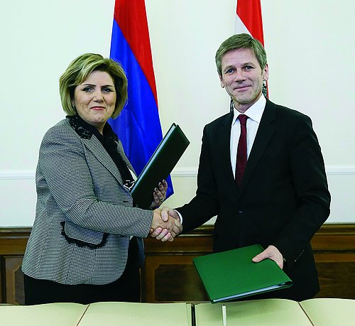 Anlässlich der Unterzeichnung eines „Memorandum of Unterstanding" zur Kooperation auf dem Gebiet Kunst und Kultur zwischen der Republik Armenien und der Republik Österreich für die Periode von 2015-2019, unterzeichnet von S.E. Dr. Josef Ostermayer (Bundesminister für Kunst und Kultur, Verfassung und Medien in Österreich) und I.E. Hasmik Poghosyan (Ministerin für Kultur der Republik Armenien), lud am 19. Januar 2015 der Botschafter und Ständige Vertreter bei den Internationalen Organisationen in Wien, S.E. Arman Kirakossian zu einer Präsentation und anschließenden Empfang in die neu errichteten Veranstaltungsräume der Botschaft. Nach spektakulären Vorstellungen der künstlerischen Aktivitäten und der musikalischen Hochgenüsse die armenische Künstler produzieren können wurde zu einem ebenso hervorragenden Buffet geladen. Wir dürfen uns recht herzlich bedanken und wünschen dem Abkommen noch viele erfolgreiche Auftritte.