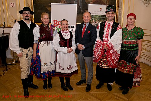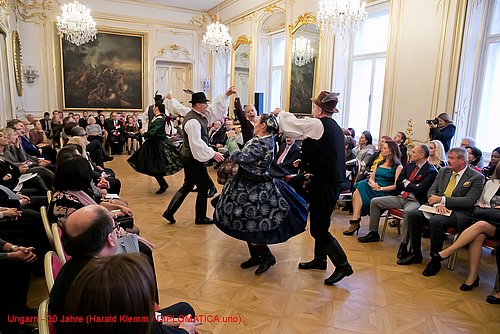 Aus Anlass „30 Jahre Freiheit“ – Tag der ungarischen Kulturgüter luden der Botschafter S.E. Dr. Andor Nagy und der Ständige Vertreter bei den Internationalen Organisation in Wien und der OSZE , S.E. Károly Dán am 20. November 2019 zu einer Veranstaltung mit Volkstanzgruppen, Modefirmen, ungarisches Kunsthandwerk und Verkostung ungarischer Spezialitäten sowie einer Ausstellung über ungarische, wissenschaftliche Erfindungen ein. So gab es großen Beifall für die Volkstanzensembles „Napraforgök“ und „Délibáb“ sowie für die Modedesignkleidung der Budapester Firma „By Me“, geleitet von Tünde Hrivnák. Höhepunkt wie immer bei ungarischen Spezialitäten war die Verkostung von Würsten, Baumkuchen, herrlichen Weinen und natürlich Palinkaschnaps. Es war ein Erfolg, wie man hörte auf allen Linien und wir danken für die gelungene Gesamtpräsentation.