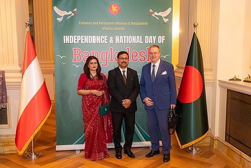 Aus Anlass des Nationalfeiertages und Unabhängigkeitstages der Volksrepublik Bangladesch luden der Botschafter Toufique HASAN und Frau Ismar JERIN am 27. März 2026 zu einem Empfang in die Festräumlichkeiten des Grand Hotel Wien. Nach den Reden und dem Anschneiden der Torte lud man zu einem kulinarischen Ausflug in die Küche von Bangladesch. Die internationalen Gäste und die Community genossen den sehr harmonischen Abend.