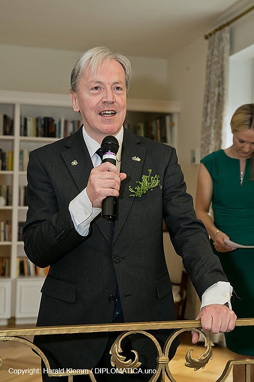 Anlässlich des St. Patrick’s Day“, des Nationalfeiertages von Irland luden in Anwesenheit der Ministerin für europäische Angelegenheiten, I.E. Helen McEntee der Botschafter, S.E. Tom Hanney und seine Gattin Paula Fitmaurice Hanney sowie der Ständige Vertreter bei der OSZE, S.E. Kevin Dowling und Frau Una Langan am 16. März 2018 zu einem Empfang in die Räumlichkeiten ihrer Residenz. Nach den Begrüßungsworten der beiden Botschafter und den kompetenten Worten der Ministerin, die zu Brexit-Gesprächen in Wien weilte, konnten sich die vielen hochrangigen Gäste sowie praktisch fast alle EU-Botschafter an kleinen irischen Köstlichkeiten erfreuen sowie das große Getränkeangebot irischer Spezialtäten weidlich nützen. Es ist immer eine Freude zu sehen wie gerne irische Getränke konsumiert werden, was wohl auch mit der außerordentlichen irischen Fröhlichkeit und Gastfreundlichkeit zusammenhängen dürfte. Zwischen den Verkostungen gab eine irische Geigenvirtuosin irische Volkslieder in Gesangsbegleitung zum Besten, während schon bei Betreten des Hauses ein irischer Dudelsackbläser der gesamten Straße lautstark den Beginn dieser Veranstaltung verkündete; eine originelle Idee!