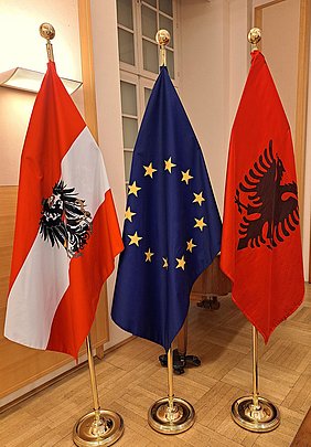 Aus Anlass des 113. Jahrestages der Unabhängigkeit der Republik Albanien luden in Anwesenheit des Parlamentspräsidenten der Republik Albanien, S.E. Niko PELESHI; der Botschafter, S.E. Fate VELAJ und die Ständige Vertreterin bei den Internationalen Organisationen in Wien, I.E. Eglantina GJERMENI am 25. November 2025 zu einem Empfang in den Festsaal der Diplomatischen Akademie.