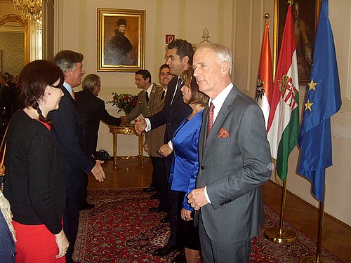 Zu einem Empfang anlässlich des 59. Jahrestages der Revolution und des Freiheitskampfes von 1956 in Ungarn gegen ihre Besatzer luden am 22. Oktober 2015 der Botschafter, S.E. Dr. Janos Perenyi und der Ständige Vertreter bei der OSZE, bei den Vereinten Nationen und anderen internationalen Organisationen in Wien, S.E. Károly Dán, in den Marmorsaal der Botschaft. In seiner Begrüßungsrede betonte der Botschafter die enge Verbundenheit beider Länder wo unzählige Ungarn nach der niedergeschlagenen Revolution eine neue Heimat gefunden haben und dankte Österreich für seine damalige außerordentliche Hilfsbereitschaft. Er kam auch auf die derzeitige Flüchtlingskrise zu sprechen und meinte, man könne trotz dieser humanitären Katastrophe seine christlichen Werte nicht preisgeben und müsse der Überflutung durch fremde Kulturen Einhalt gebieten, wie dies Ungarn bereits vorgezeigt habe. Im Anschluss folgten die gesungenen Hymnen beider Länder und darauf bat der Botschafter zum Buffet, was sich die unglaublich große Gästeschar nicht zweimal sagen ließ. Viele ausländische Botschafter waren anwesend, allerdings einige Vertreter großer Staaten ließen sich vertreten. Starke Präsenz zeigte auch die Wirtschafts- und Kulturmanager beider Staaten und naturgemäß die überaus große ungarische Community in Österreich. Aus der Sicht vieler dieser ungarischen Neo-Österreicher und Einheimischer hat der ungarische Ministerpräsident absolut richtig gehandelt, als er den gewaltigen Flüchtlingsstrom in sein Land abrupt stoppte. Es kann nicht sein, dass Menschen fremder Kulturen Europa überrennen und die nationalen Regierungen und der Wasserkopf der EU in Brüssel schauen hilflos zu. Wenn diese zügellose Einwanderung so weitergeht braucht man wohl kein großer Prophet sein, um das Ende der EU in absehbarer Zeit vorherzusagen.