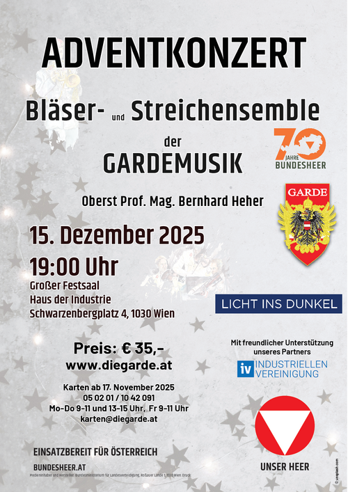 Das Bläser- und Streichensemble der Gardemusik unter Oberst Prof. Mag. Berhard Heher spielt am 15. Dezember 2025 um 19 Uhr im Großen Festsaal des Hauses der Industrie ein Adventkonzert. Karten können unter karten@diegarde.at bestellt werden.