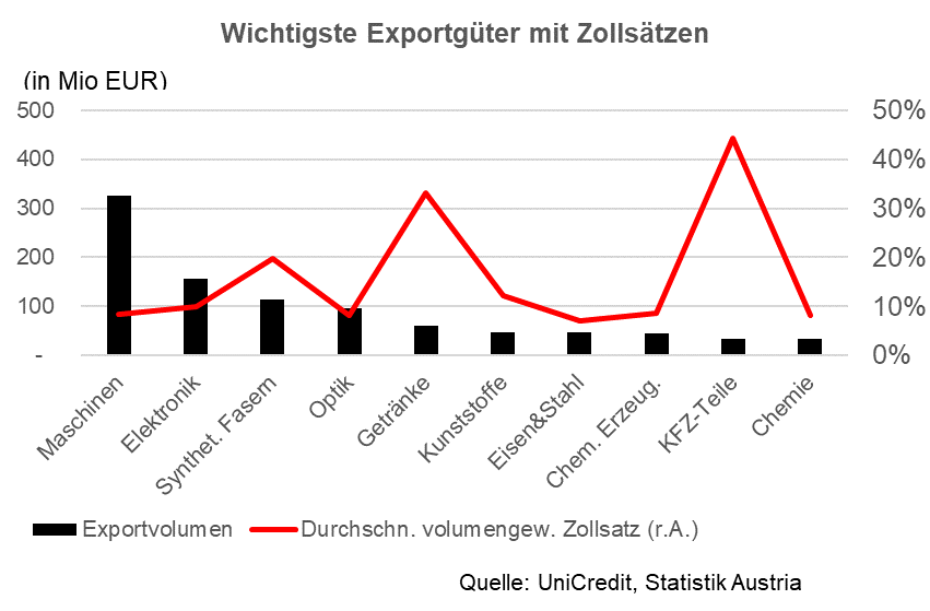 Durchschnittliche Zölle von über 12 Prozent (gewichtet mit dem Exportvolumen) auf österreichische Exporte belasten derzeit insbesondere die KFZ‑Industrie, die Getränkeindustrie sowie Teile des Maschinenbaus. Mit einem Abkommen sollen über 90 Prozent dieser Zölle wegfallen. Insgesamt betrug 2024 die Belastung der österreichischen Exporte nach Indien durch Zölle ca. 160 Millionen Euro.